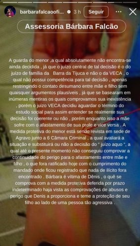 Em comunicado divulgado pela equipe da empresária, o texto descreve o produtor como uma “pessoa agressiva”: “Bárbara é vítima de Dennis, o que se comprova com a medida protetiva deferida por prazo indeterminado, haja vista as comprovações de abusos e perigo que Dennis a proporciona. Ela teme a proteção de seu filho ao lado de uma pessoa tão agressiva”.