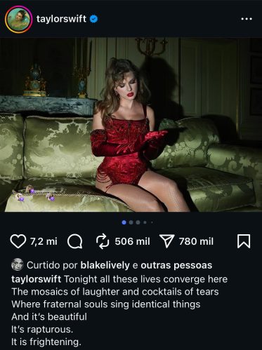 Além de Blake, outras amigas da cantora também reagiram à postagem. Mas os fãs de Taylor foram rápidos em notar possíveis conexões entre a atriz e uma das faixas do álbum. A música “Cancelled!”, décima do disco, traz versos sobre amizades que enfrentam escândalos e julgamentos públicos.