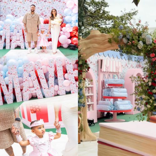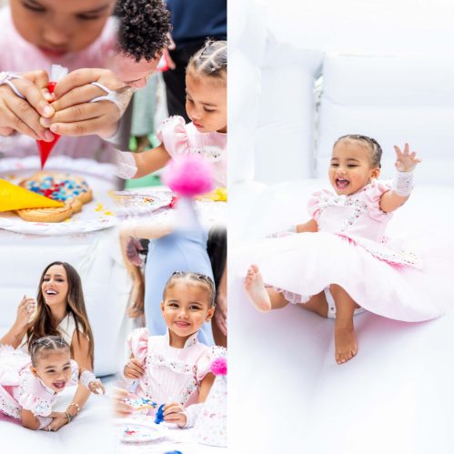 O espaço, totalmente coberto para proteger da chuva, foi dividido em ambientes decorados em azul, branco, rosa bebê e vermelho, com almofadas floridas e detalhes personalizados com a inicial “M” de Mavie. O bolo, inspirado na história da Branca de Neve, ficou em destaque rodeado por flores, passarinhos azuis e até uma cesta de maçãs no topo.