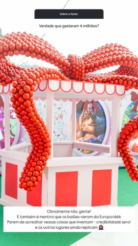 “Verdade que gastaram 4 milhões?”, questionou o seguidor. “Obviamente não, gente! E também é mentira que os balões vieram da Europa! Parem de acreditar nessas coisas que inventam – credibilidade zero! E os outros lugares ainda replicam”, respondeu ela.
