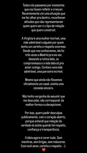 Nesta quarta-feira (8), Vini Jr. surpreendeu seus seguidores ao postar um pedido de desculpas à Virginia. Os dois estavam vivendo um affair até que conversas entre o jogador e uma modelo brasileira foram divulgadas pelo jornalista Leo Dias.