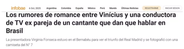 O jornal argentino Infobae cravou que “os boatos de romance entre Vinícius e uma apresentadora de TV e ex-companheira de um cantor estão dando o que falar no Brasil”. A manchete reforça que a presença dela no Bernabéu transformou o caso em notícia internacional.
