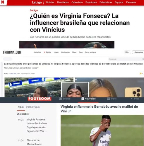 O site Tribuna.com publicou versões em inglês, francês e espanhol sobre a presença de Virginia no jogo do Real Madrid. O portal comparou imagens e levantou indícios de que ela estaria hospedada na casa de Vini, além de destacar a aproximação da influenciadora com Tainá Militão, esposa do zagueiro Éder Militão. Já o francês Footboom destacou que Virginia “incendiou o Bernabéu com a camisa de Vini Jr.” e refletiu sobre o peso das redes sociais na vida de atletas.