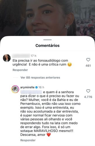 “Ela precisa ir ao fonoaudiólogo com urgência! E não é uma crítica ruim”, escreveu a internauta. Ary, por sua vez, esclareceu que seu jeito de falar é apenas reflexo de seu sotaque pernambucano e que isso não deveria ser tratado como um problema.