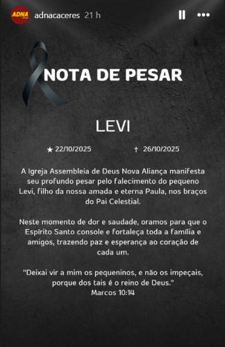 “A Igreja Assembleia de Deus Nova Aliança manifesta seu profundo pesar pelo falecimento do pequeno Levi, filho da nossa amada e eterna Paula, nos braços do Pai Celestial. Neste momento de dor e saudade, oramos para que o Espírito Santo console e fortaleça toda a família e amigos, trazendo paz e esperança ao coração de cada um”, diz o comunicado.