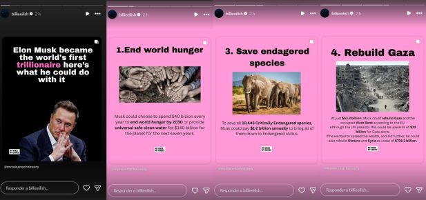 Nos stories, Billie compartilhou publicações sugerindo formas como o empresário poderia usar seu dinheiro para transformar o planeta — entre elas erradicar a fome mundial, salvar espécies em extinção ou reconstruir Gaza.