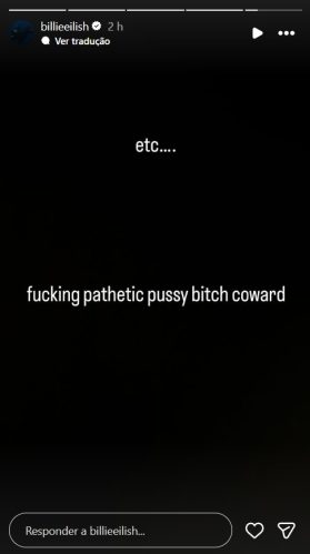 Por fim, ela xingou o empresário. (Foto: Reprodução / Instagram)Conhecida por posicionamentos políticos progressistas, Billie já havia criticado a concentração de riqueza em discursos recentes. No fim de outubro, durante o WSJ Magazine Innovator Awards, ela defendeu que bilionários deveriam “abrir mão de suas fortunas e devolver o dinheiro ao povo”.