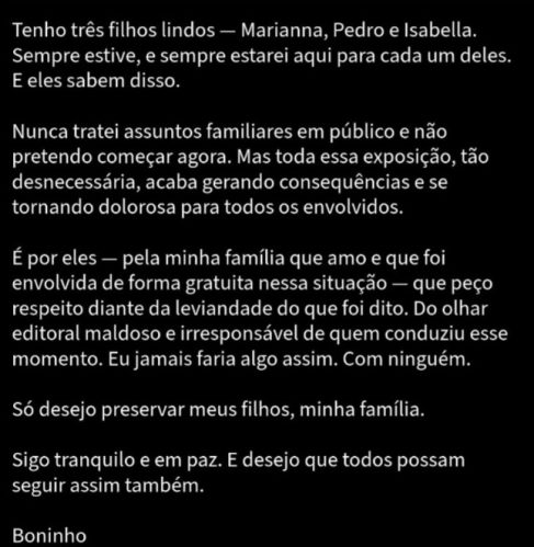 No texto, Boninho afirmou que sempre esteve presente para os três filhos. “Tenho três filhos lindos — Marianna, Pedro e Isabella. Sempre estive, e sempre estarei aqui para cada um deles. E eles sabem disso”, escreveu. O diretor disse que raramente fala sobre assuntos pessoais publicamente, mas que a exposição se tornou “desnecessária”: “Acaba gerando consequências e se tornando dolorosa para todos os envolvidos”.
