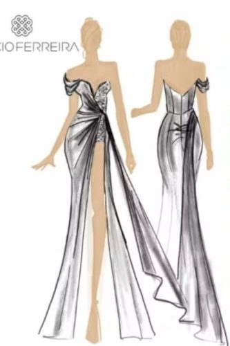 Após a repercussão, o portal Leo Dias teve acesso ao croqui do vestido, assinado pelo designer Marcio Ferreira. O desenho original, divulgado neste sábado (11), revelou um visual bem diferente do resultado final. Além da ausência do drapeado previsto, o caimento também ficou distante do idealizado pelo estilista, que disse ao gshow ter se inspirado em princesas e no estilo sexy da atriz.