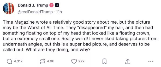 Em uma postagem na Truth Social, sua própria rede social, o empresário reclamou e disse que a foto o fazia parecer careca.