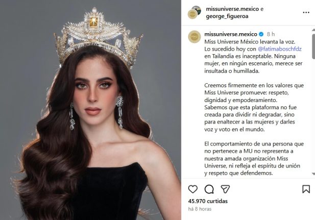 A publicação do Miss Universo México após o episódio com Fátima. (Foto: Reprodução/ Instagram)Já o Miss Universo se manifestou por meio de uma nota: “A Organização Miss Universo (MUO) reafirma seu compromisso de trabalhar em estreita colaboração com a comunidade anfitriã, a Miss Grand International Organization (MGI), e todos os parceiros locais para garantir o sucesso contínuo do 74º concurso Miss Universo. Juntos, dedicamo-nos a defender os mais altos padrões de respeito, segurança e integridade para todos os participantes, funcionários e stakeholders.”