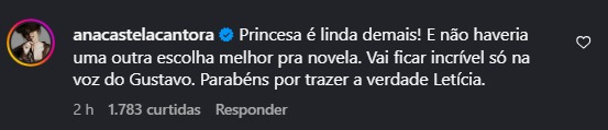 Ana Castela também se manifestou e elogiou a escolha da canção. “’Princesa’ é linda demais. E não haveria uma outra escolha melhor para novela. Vai ficar incrível só na voz do Gustavo”, escreveu a sertaneja nos comentários da página “Let’s Gossip” no Instagram, mostrando que não há desentendimento entre eles.