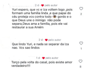 Yuri, então, curtiu alguns comentários de seguidores que sugeriam a reconciliação com IZA. “Yuri, espero que você e a IZA voltem logo, pois formam uma família linda, e que Papai do Céu proteja vocês contra todo olho gordo. O que Deus une, o inimigo não pode separar. Deus ama a família, por isso Ele vai restaurar a sua. Amém”, escreveu um deles.