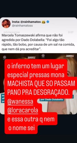 Nos Stories, Luana compartilhou parte da fala de Marcela e fez críticas. A atriz também citou Wanessa Camargo — que viveu dois relacionamentos com Dado — e Carolina Dieckmmann. “O inferno tem um lugar especial para essas monas machistas que passam pano pra desgraçado. Wanessa, Carolina Dieckmmann e essa outra que nem o nome sei”, escreveu, marcando os perfis de Wanessa e Carolina.