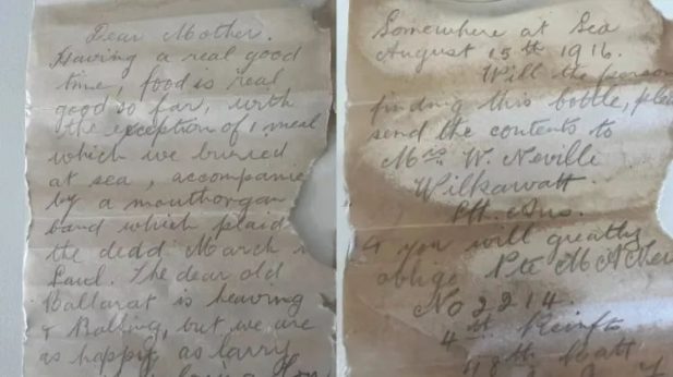 Durante uma limpeza de praia na Austrália Ocidental, mãe e filha encontraram uma garrafa com cartas escritas por soldados da Primeira Guerra Mundial. As mensagens, datadas de 1916, foram entregues às famílias dos combatentes e devem integrar o acervo de museus locais.