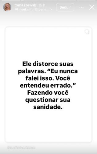 Em entrevista à Lucas Pasin, do Metrópoles, Tomaszewski revelou ter terminado o namoro nesta sexta (7), e que não há chances de reconciliação. “Terminamos hoje. Não tem mais relacionamento e nunca mais vai ter. Estou bem, mas não existe mais nada entre eu e ele”, garantiu.