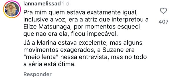 A cena viralizou nas redes sociais e impressionou pela forma como Marina interpretou Suzane. “Credo, tá tão bom que até assusta”, escreveu um perfil. “Show de talento e interpretação”, comentou outra pessoa. “Nossa, as expressões deixaram ela idêntica”, reagiu um usuário.