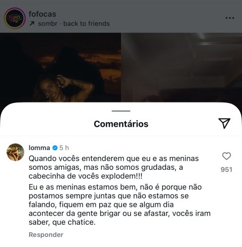 Diante da repercussão, Lomma decidiu se pronunciar. “Quando vocês entenderem que eu e as meninas somos amigas, mas não somos grudadas, a cabecinha de vocês explode. Eu e as meninas estamos bem. Não é porque não postamos sempre juntas que não estamos nos falando. Fiquem em paz que se algum dia acontecer da gente brigar ou se afastar, vocês irão saber. Que chatice”, escreveu ela nos comentário do perfil “Fofocas”, no Instagram.