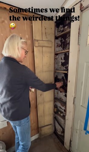 Uma mulher encontrou uma porta secreta durante a reforma de sua casa, e acabou sendo surpreendida pelo conteúdo que estava escondido. Em um vídeo divulgado pelo perfil SoPo Cottage, no Instagram, ela não conteve o riso ao ver que algumas latas de laxante estavam armazenadas há anos no local.