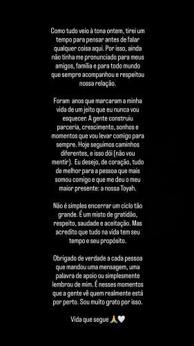 Ele também relembrou os momentos vividos com Pocah e falou com carinho sobre a relação com Vitória, filha da cantora: “A gente construiu parceria, crescimento, sonhos e momentos que vou levar comigo para sempre. Hoje seguimos caminhos diferentes, e isso dói (não vou mentir). Eu desejo, de coração, tudo de melhor para a pessoa que mais somou comigo e que me deu o meu maior presente: a nossa Toyah”.