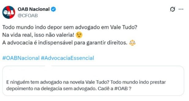 A entidade se pronunciou após um perfil do X apontar a inconsistência com a realidade nas cenas de “Vale Tudo”. “E ninguém tem advogado na novela ‘Vale Tudo’? Todo mundo indo prestar depoimento na delegacia sem advogado. Cadê a OAB?”, questionou.