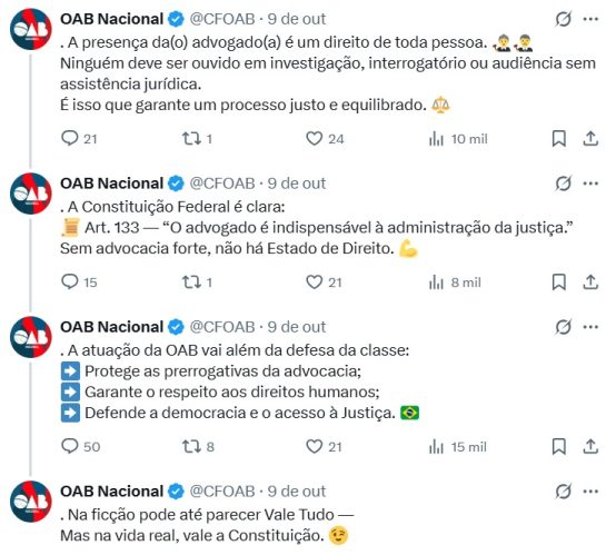 Por fim, o perfil da Ordem no X explicou sua atuação vai além da defesa de classe. “A Constituição Federal é clara: Art. 133 — ‘O advogado é indispensável à administração da justiça’. Sem advocacia forte, não há Estado de Direito. A atuação da OAB protege as prerrogativas da advocacia, garante o respeito aos direitos humanos e defende a democracia e o acesso à Justiça”, concluiu.